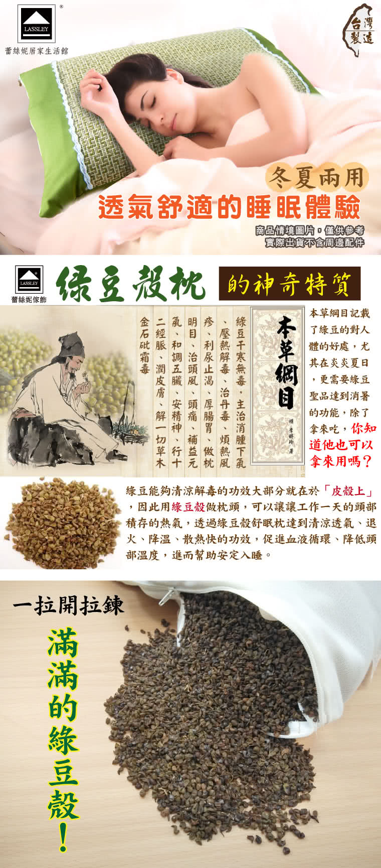 【Lassley蕾絲妮】綠豆殼亞藤舒眠枕-綠色蕾絲(台灣製造 冬夏兩用 舒眠 天然 透氣 清涼 殼枕 草蓆)到哪裡買比較便宜還有哪些類似商品