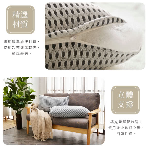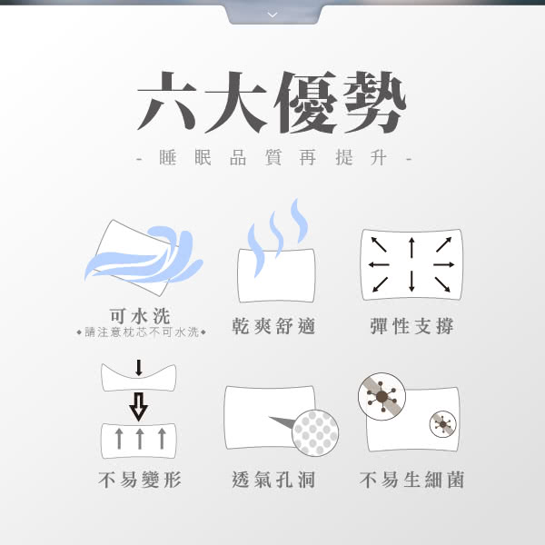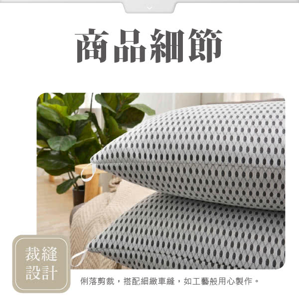 使用百分之百聚酯纖維,6D立體結構設計,循環透氣,增加枕芯空間的氣流,不斷與外界交換空氣,使濕熱可以從任意角度自由流通,保持適宜的溫度與乾爽環境,保有空氣對流,不悶熱超涼爽給予極舒適的睡眠。